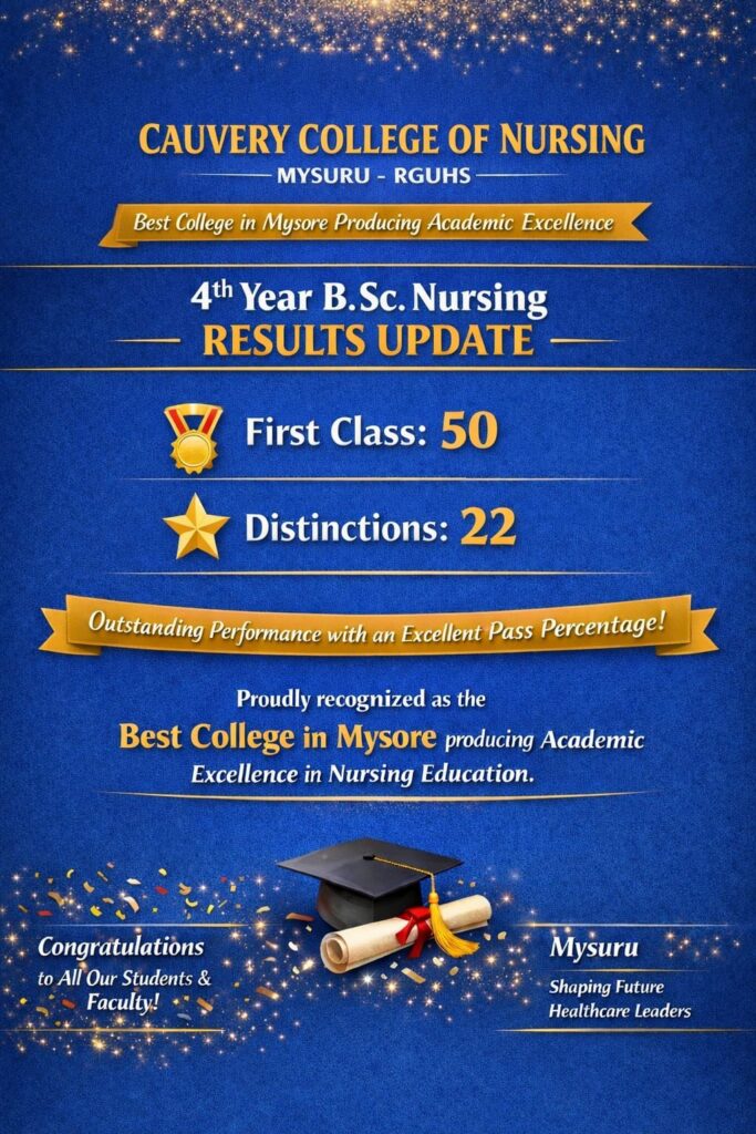 Cauvery College of Nursing, Mysuru, affiliated with Rajiv Gandhi University of Health Sciences (RGUHS), proudly announces the excellent performance of our 4th Year B.Sc Nursing students in the recent university examinations. The results reflect the strong academic environment and the dedication shown by both students and faculty members throughout the academic year.